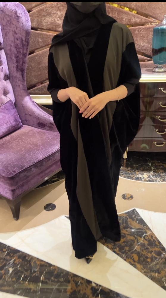 عبايه قماش مخمل قصه فراشه ب اكمام استرتش مخمل اسود مع تدخليه بلون زيتي الفاخر مع طرحه يفضل غسيل يدوي او بخار